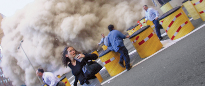 Another building starts to implode. Watch people use scraps of ripped clothing to cover their mouths. See people crying, bleeding, dragging one another to safety. Look at how their mouths form great big O’s of disbelief.