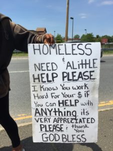 I wondered if a panhandler’s guide had been published somewhere: a list of situations that might be included on signs to induce donations (children, housing, illness, hunger, shelter, etc.), how often to change your sign, the importance of accurate spelling and readable penmanship, clothes to wear to convey poverty, what not to wear, where to stand, tolerating the weather, hiding your belongings, and so on.