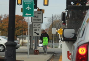 November 16. It’s 11:30 in the morning. Ashley is on the other side of the street by the abandoned Burger King, smoking and laughing with Walmart guy, who has his own shabby homeless garb and a white poster board sign. It looks as if her shift today doesn’t start until 12, because some other guy is at her usual post.