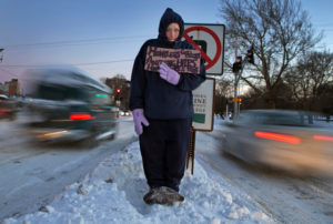 and the other regulars on their median strips carve a footpath down the middle of the snowy median as they go back and forth all day long. Panhandlers used to be seen around here only in the summers.